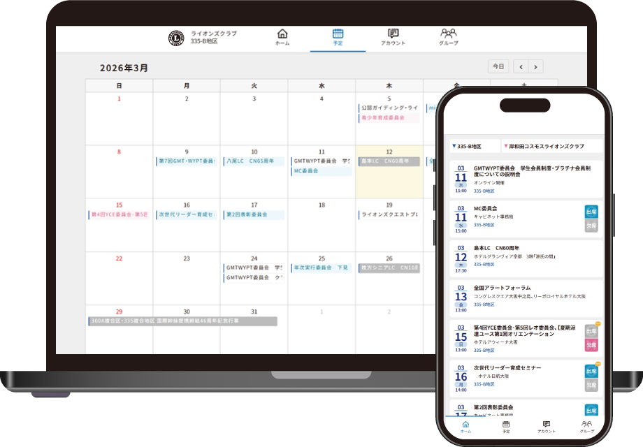予定の管理はグループ単位(地区・各クラブ)で行います。